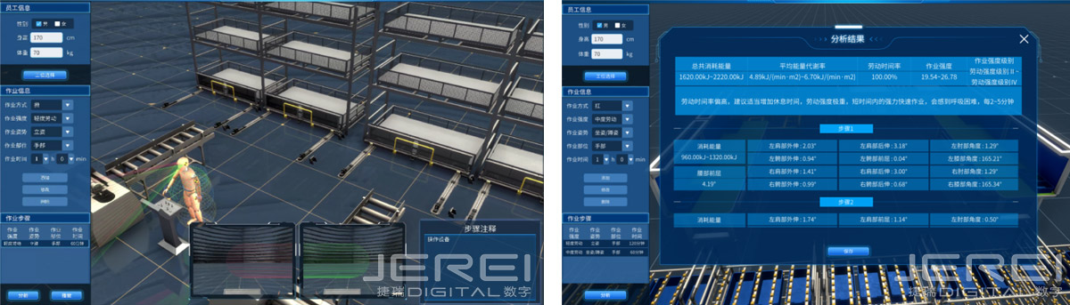 通過人工可達(dá)性分析,可以計(jì)算相應(yīng)的訂單完成率,人工工位疲勞度以及人工作業(yè)能耗分析等,幫助管理者合理安排任務(wù),合理規(guī)劃作業(yè)步驟。