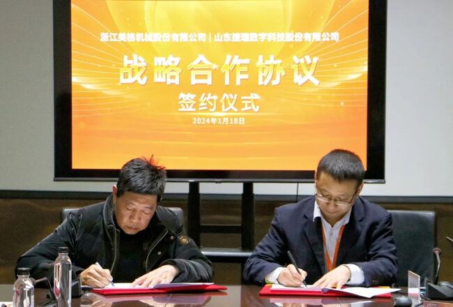 2024年1月18日,山東捷瑞數(shù)字科技股份有限公司(以下簡稱“捷瑞數(shù)字”)與浙江美格機械股份有限公司(以下簡稱“美格機械”)簽署戰(zhàn)略合作協(xié)議,美格機械董事長劉國方,捷瑞數(shù)字副總經(jīng)理、CTO安士才代表雙方在協(xié)議書上簽字。